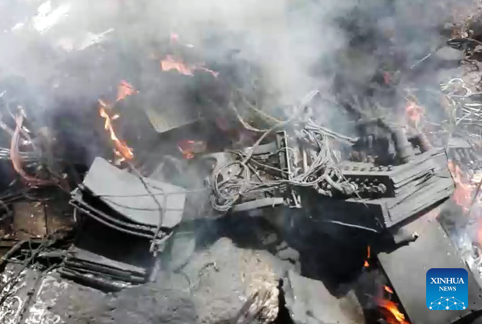 This video screenshot provided by the Houthi media outlets shows the downed U.S. MQ-9 drone burning in Sanaa province, Yemen, April 19, 2025. Yemen's Houthi group said Saturday it shot down another U.S.-made MQ-9 drone over Sanaa province in the past 24 hours. (Xinhua)