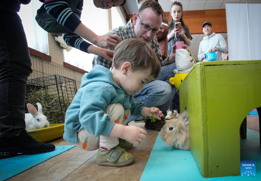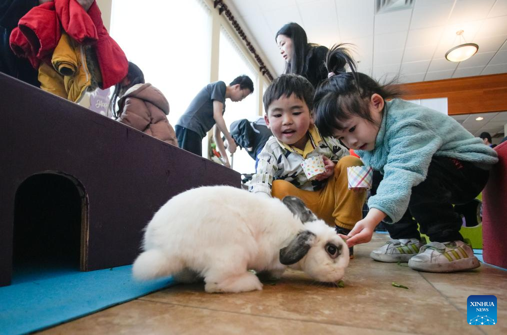 Children interact with a rabbit during the Easter Bunny Fest event in Richmond, British Columbia, Canada, April 20, 2025. A family-friendly event featuring "meet and treat" interaction with bunnies rescued by a local animal welfare charity was held here in celebration of Easter. (Photo by Liang Sen/Xinhua)