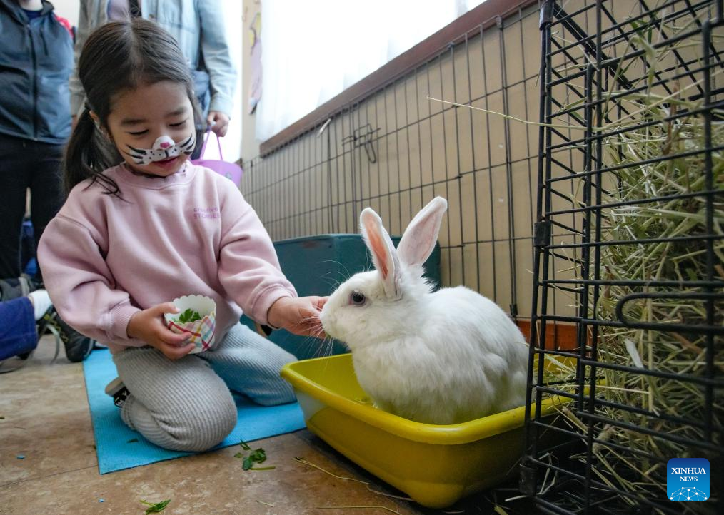 A girl interacts with a rabbit during the Easter Bunny Fest event in Richmond, British Columbia, Canada, April 20, 2025. A family-friendly event featuring "meet and treat" interaction with bunnies rescued by a local animal welfare charity was held here in celebration of Easter. (Photo by Liang Sen/Xinhua)