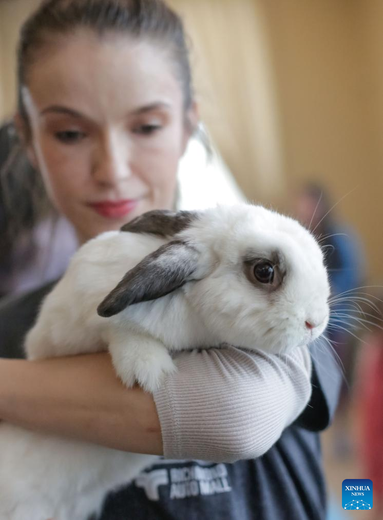 A woman holds a rabbit during the Easter Bunny Fest event in Richmond, British Columbia, Canada, April 20, 2025. A family-friendly event featuring "meet and treat" interaction with bunnies rescued by a local animal welfare charity was held here in celebration of Easter. (Photo by Liang Sen/Xinhua)