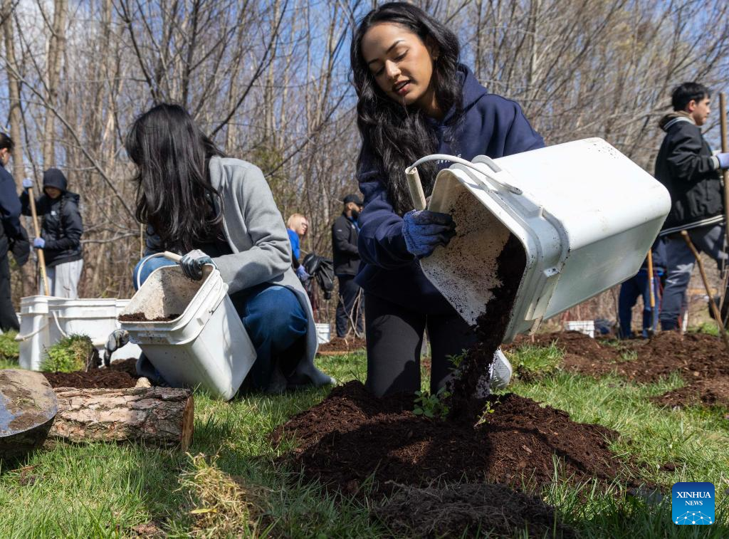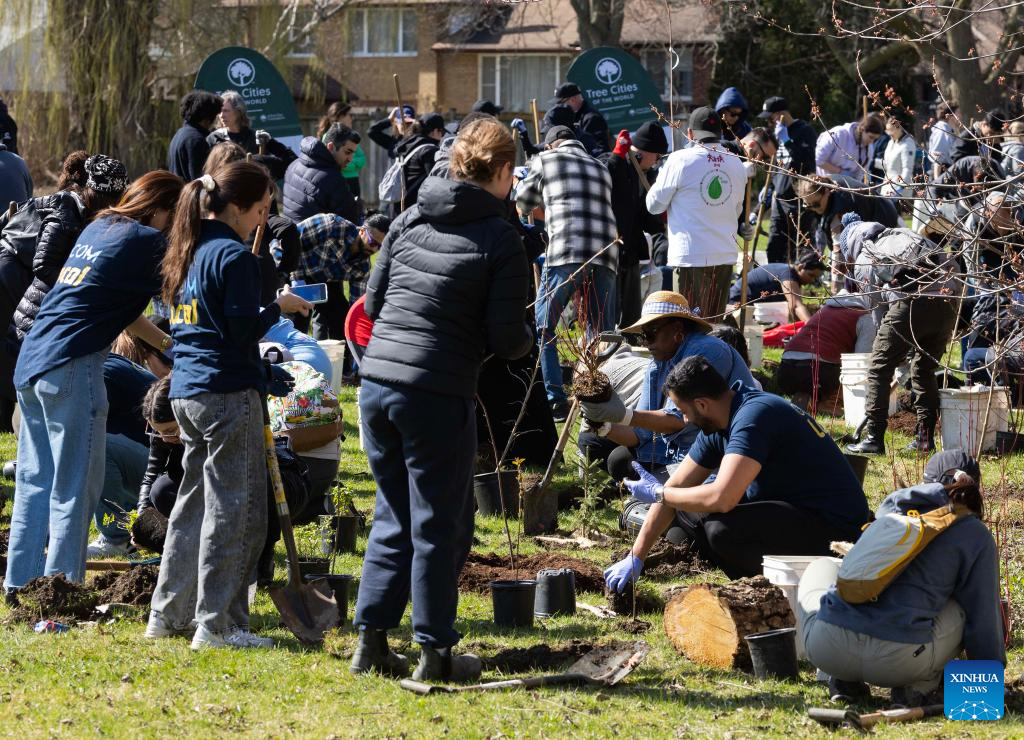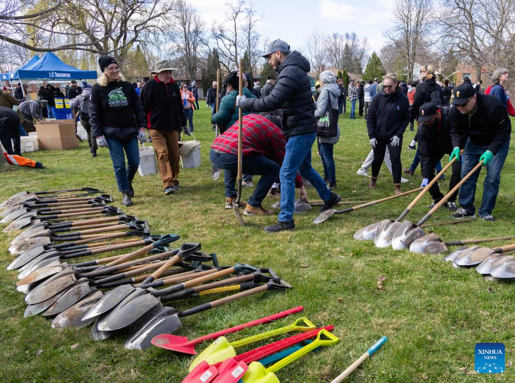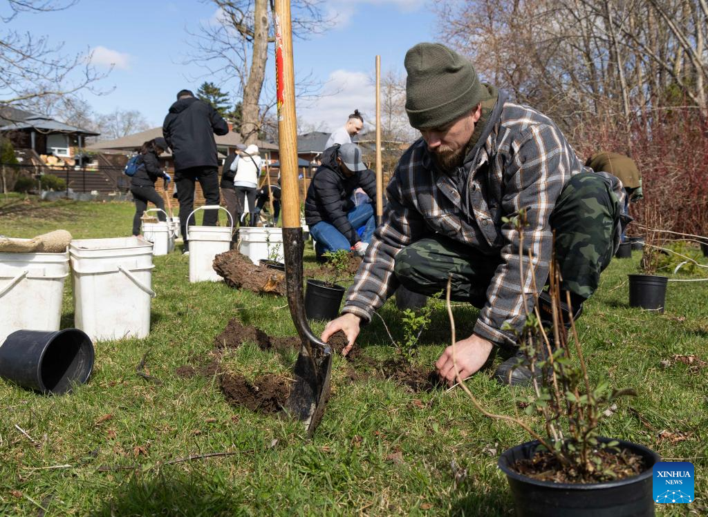 (250422) -- TORONTO, April 22, 2025 (Xinhua) -- People participate in a tree planting event at a park in Toronto, Canada, on April 22, 2025. About 160 people took part in the tree planting event here on Tuesday to mark Earth Day. (Photo by Zou Zheng/Xinhua)