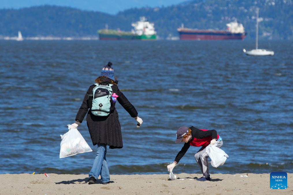 Volunteers pick up litter during a beach cleanup event at Kitsilano Beach in Vancouver, British Columbia, Canada, on April 22, 2025. Volunteers participated in the beach cleanup event here on Tuesday to mark Earth Day. (Photo by Liang Sen/Xinhua)