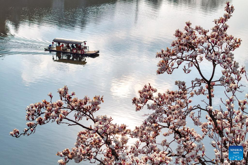 Visitors enjoy flowers in Shitan Village of Shexian County, Huangshan City of east China's Anhui Province, March 26, 2025. Located at the junction of Huangshan Mountains and Xin'an River, Shexian County of east China's Anhui Province has carried the essence of Hui-style culture and architecture. Huizhou Ancient City, lying at the heart of Shexian, is one of the best-preserved ancient towns in China. Its network of ancient streets, alleys, and bridges is complemented by traditional residences, ancestral halls, and memorial archways.
