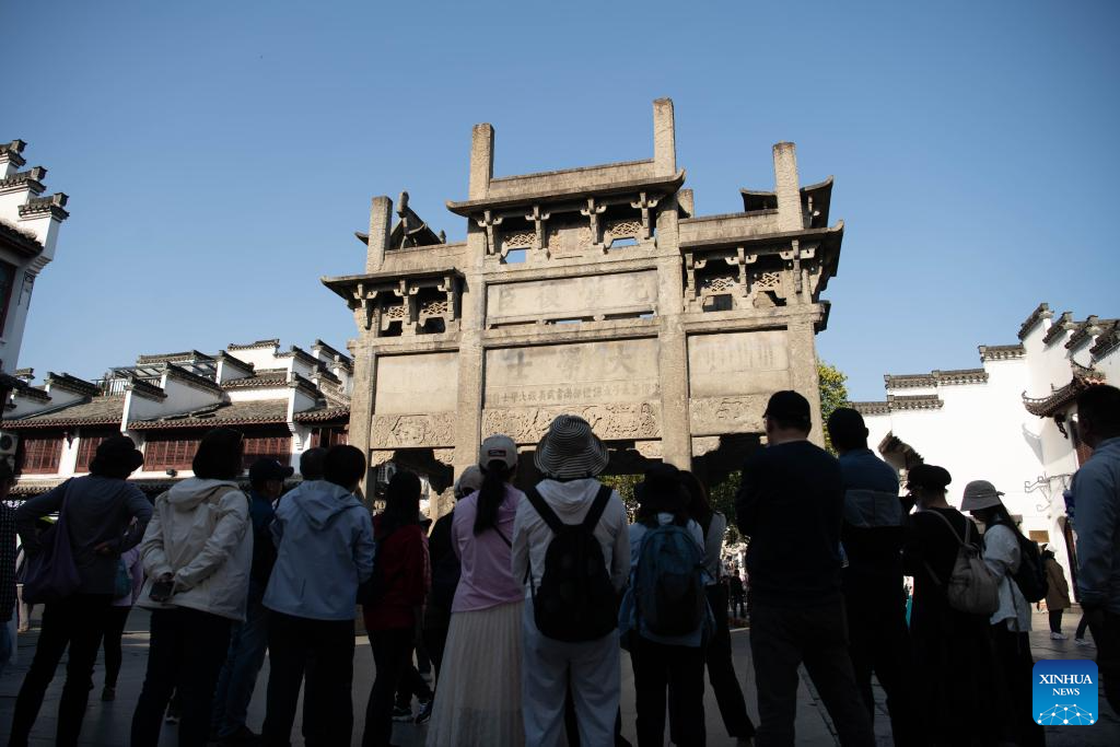 Tourists visit the Huizhou ancient town in Shexian County of Huangshan City, east China's Anhui Province, March 25, 2025. Located at the junction of Huangshan Mountains and Xin'an River, Shexian County of east China's Anhui Province has carried the essence of Hui-style culture and architecture. Huizhou Ancient City, lying at the heart of Shexian, is one of the best-preserved ancient towns in China. Its network of ancient streets, alleys, and bridges is complemented by traditional residences, ancestral halls, and memorial archways.
