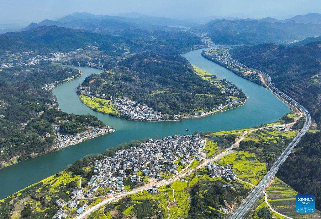 An aerial drone photo shows a view of Xin'an River Scenic Area in Shexian County of Huangshan City, east China's Anhui Province, March 22, 2024. Located at the junction of Huangshan Mountains and Xin'an River, Shexian County of east China's Anhui Province has carried the essence of Hui-style culture and architecture. Huizhou Ancient City, lying at the heart of Shexian, is one of the best-preserved ancient towns in China. Its network of ancient streets, alleys, and bridges is complemented by traditional residences, ancestral halls, and memorial archways.