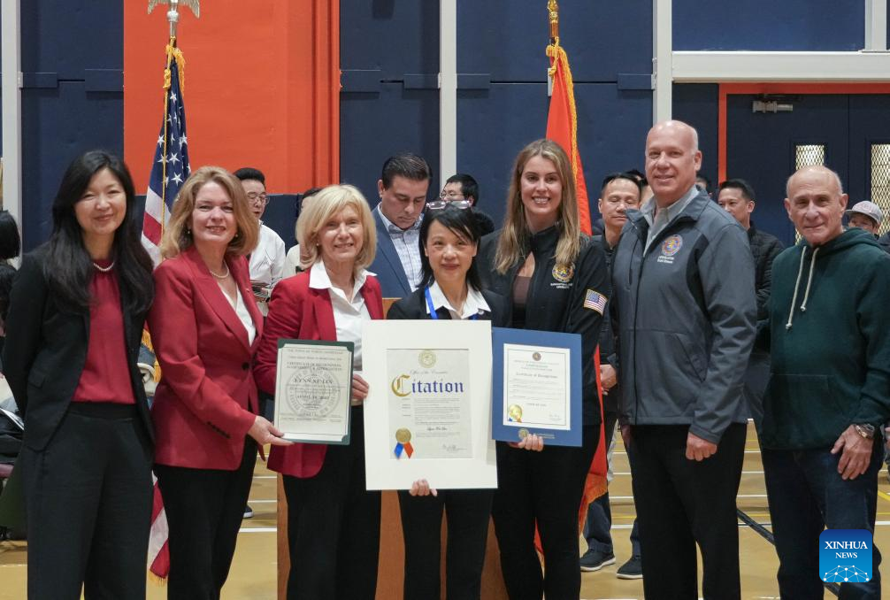 International Wushu judge Lynn Lin (C) accepts recognition certificates from local government officials at the opening ceremony of the 2025 International Wushu Championships in Nassau County, New York State, the United States, on April 19, 2025. The 2025 International Wushu Championships, held on April 19, transformed Long Island into a hub of martial arts excellence. Hosted by the Tai Chi Qigong Association of America in partnership with the Nassau County Office of Asian American Affairs, the event welcomed 268 athletes from across the United States and Canada, representing a vibrant mosaic of cultures, backgrounds, and generations. (Photo by Zack Zhang/Xinhua)