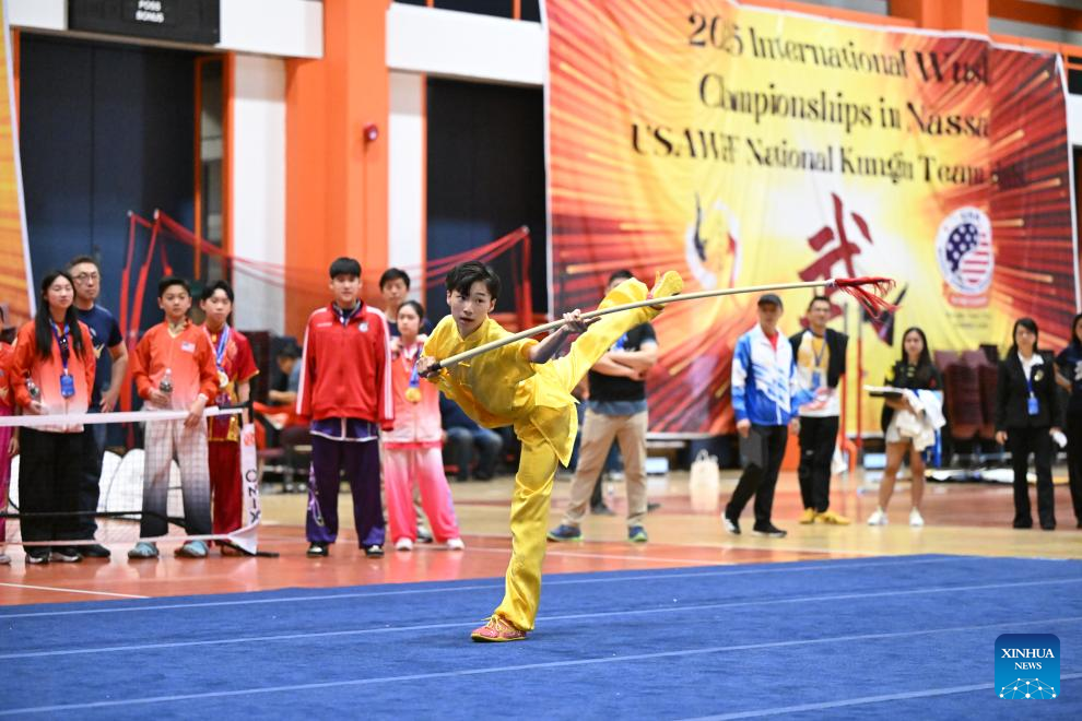Canadian martial artist Venus Li performs at the 2025 International Wushu Championships in Nassau County, New York State, the United States, on April 19, 2025. The 2025 International Wushu Championships, held on April 19, transformed Long Island into a hub of martial arts excellence. Hosted by the Tai Chi Qigong Association of America in partnership with the Nassau County Office of Asian American Affairs, the event welcomed 268 athletes from across the United States and Canada, representing a vibrant mosaic of cultures, backgrounds, and generations. (Photo by Christopher Hale/Xinhua)