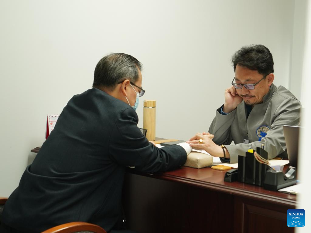 Wang Lepeng (R), an associate professor from the Beijing University of Chinese Medicine (BUCM), checks a visitor's pulse during a free clinic hosted by BUCM and New York-based Smart Health TCM Medical Center (Smart Health TCM) in Manhattan, New York, the United States, on April 25, 2025. (Photo by Ada Zhang/Xinhua)