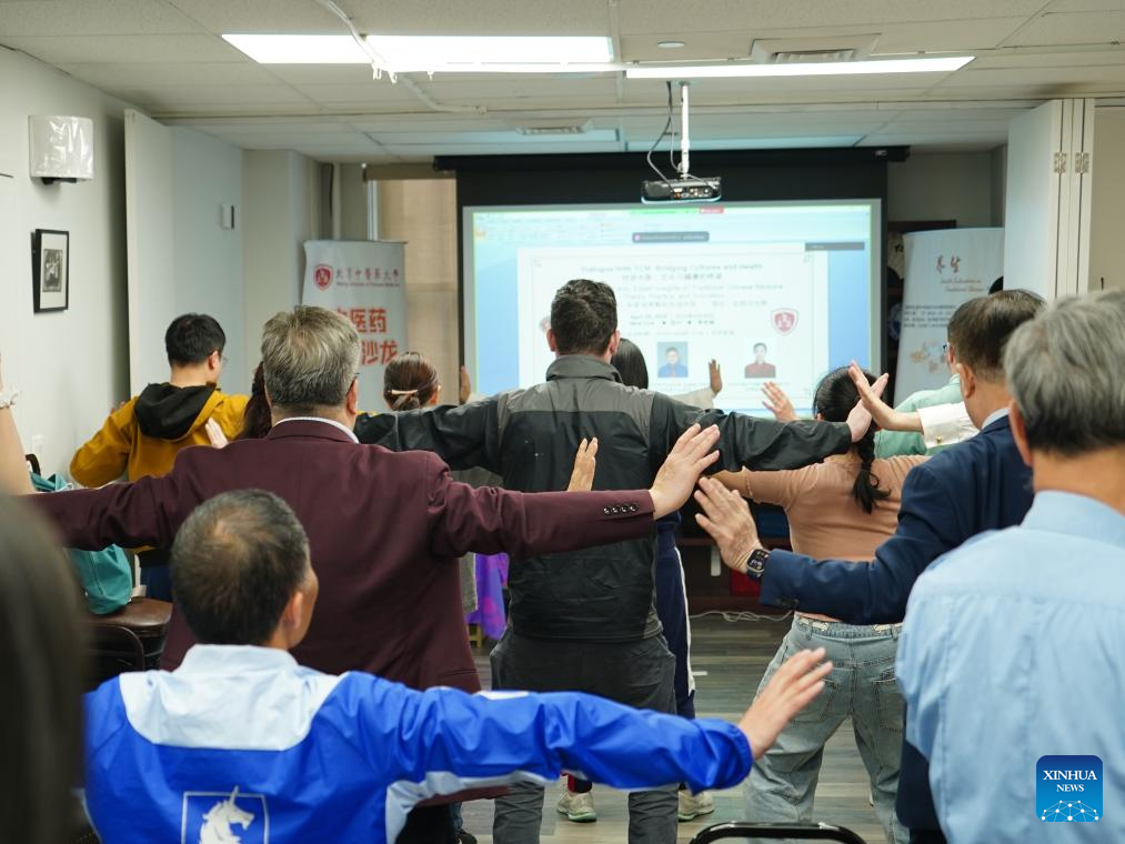 Visitors practice traditional Chinese aerobic exercise Baduanjin or Eight Pieces of Brocade, at New York-based Smart Health TCM Medical Center (Smart Health TCM) in Manhattan, New York, the United States on April 25, 2025. (Photo by Ada Zhang/Xinhua)