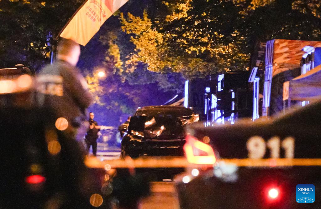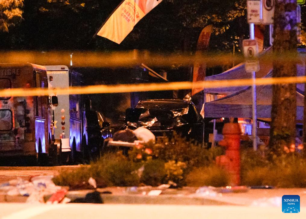 This photo taken on April 27, 2025 shows the car which was driven into a crowd in Vancouver, Canada. Nine people have been confirmed dead after a driver drove into a crowd at a street festival in Vancouver, Canada, on Saturday evening, local police said on Sunday. (Photo by Liang Sen/Xinhua)