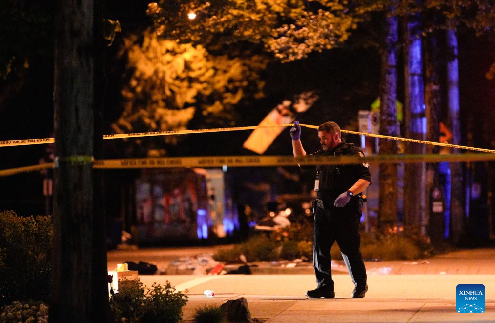 A policeman works at the site of a car striking incident in Vancouver, Canada, April 27, 2025. Nine people have been confirmed dead after a driver drove into a crowd at a street festival in Vancouver, Canada, on Saturday evening, local police said on Sunday. (Photo by Liang Sen/Xinhua)