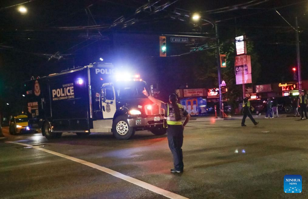 This photo taken on April 27, 2025 shows police vehicles at the site of a car striking incident in Vancouver, Canada. Nine people have been confirmed dead after a driver drove into a crowd at a street festival in Vancouver, Canada, on Saturday evening, local police said on Sunday. (Photo by Liang Sen/Xinhua)