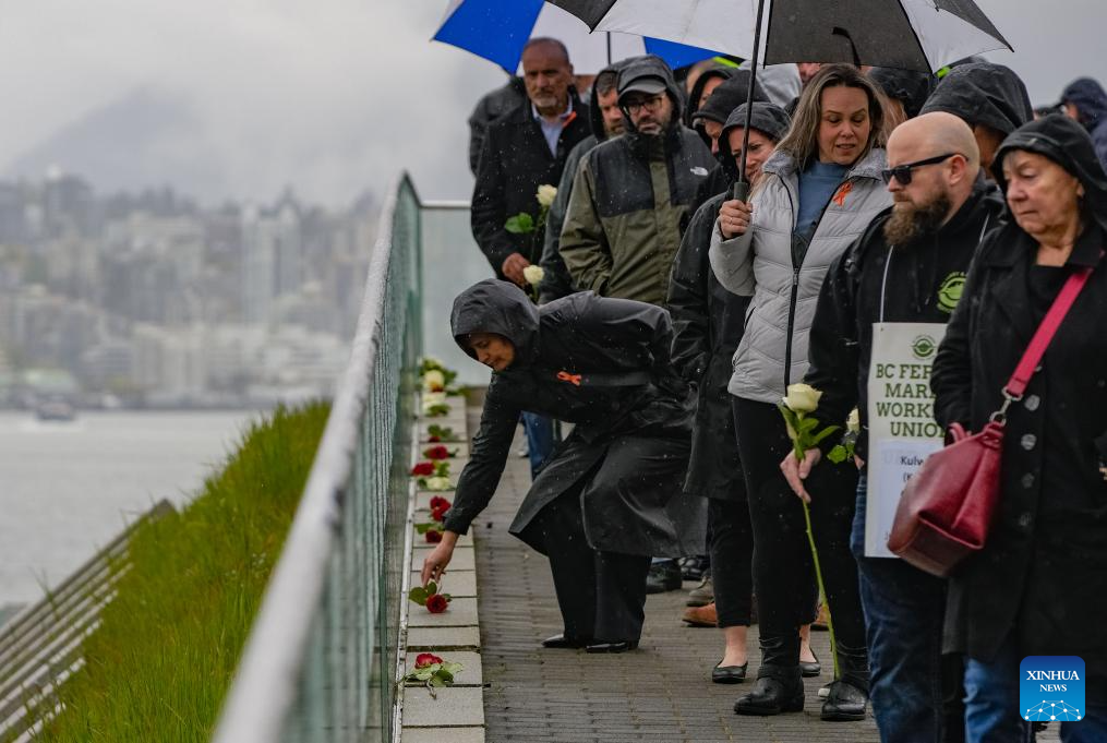 People observe a moment of silence during the National Day of Mourning event in Vancouver, British Columbia, Canada, on April 28, 2025. The National Day of Mourning is observed annually in Canada on April 28 to commemorate people who have lost their lives, suffered injury or illness on the job, or experienced a work-related tragedy, and to raise awareness of health and safety in the workplace. (Photo by Liang Sen/Xinhua)