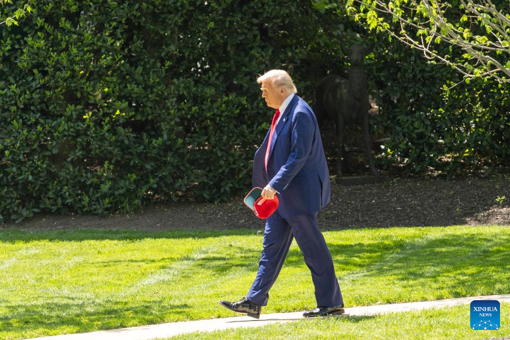 U.S. President Donald Trump walks toward the South Lawn to board Marine One at the White House in Washington, D.C., the United States, on April 29, 2025. The Trump administration has discharged a group of scientists and researchers working on the federal government's evaluation of the impact of climate change, citing the need to re-evaluate its approach to the project, reported The Wall Street Journal on Tuesday. (Xinhua/Hu Yousong)