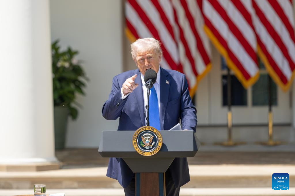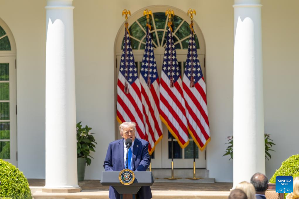 U.S. President Donald Trump speaks during a National Day of Prayer event at the White House in Washington, D.C., the United States, on May 1, 2025. (Xinhua/Hu Yousong)