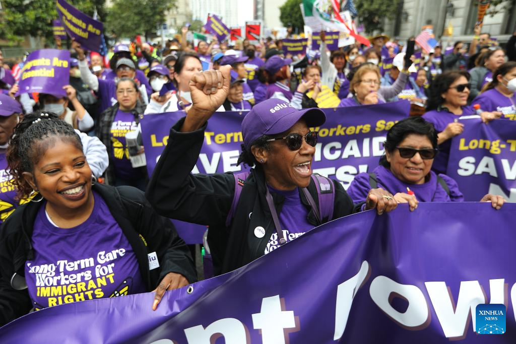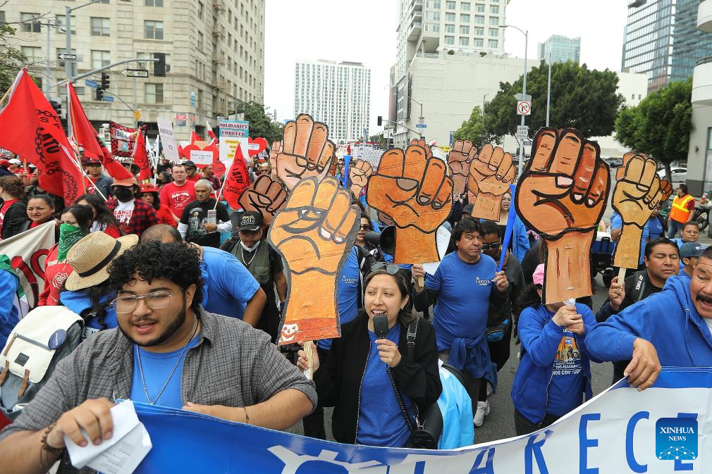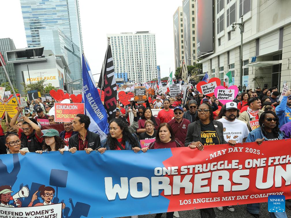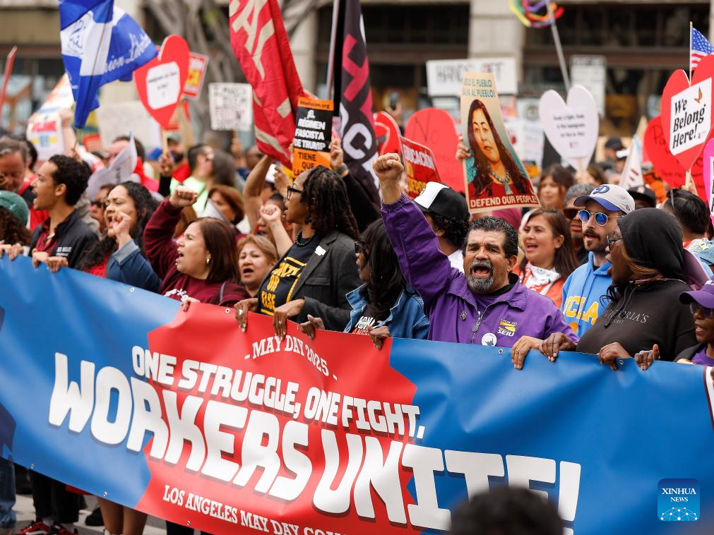 LOS ANGELES, May 1 (Xinhua) -- Thousands of people gathered in downtown Los Angeles, U.S. state of California, on Thursday for International Workers' Day rallies and marches, organized by the Los Angeles May Day Coalition, to advocate for workers' and immigrants' rights.