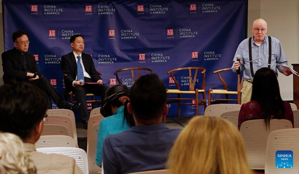 Frank Kouwenhoven (R, back), a Dutch scholar and founder of CHIME, a platform for Chinese music, speaks during the annual international conference of the U.S.-China Music Institute at the China Institute in New York, the United States, May 1, 2025. (Photo by Ada Zhang/Xinhua)