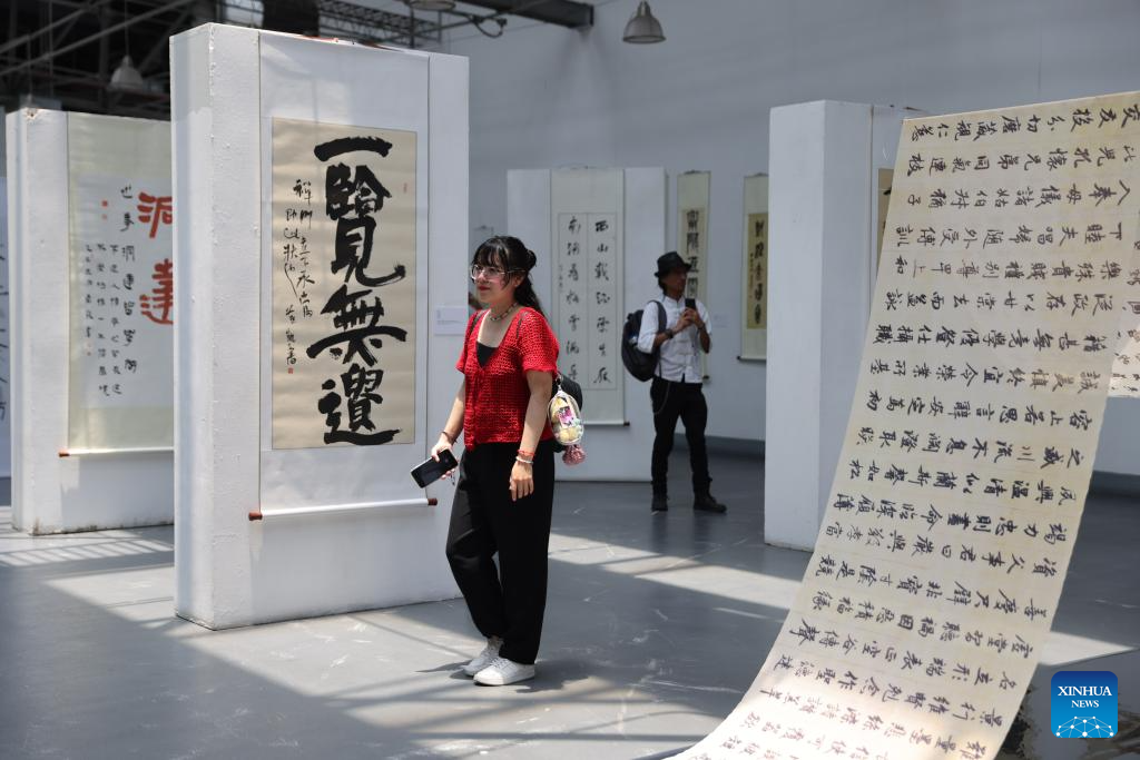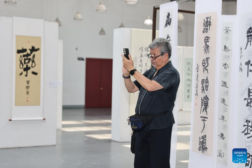 A visitor watches calligraphy works at a Chinese calligraphy exhibition in Mexico City, capital of Mexico, on May 3, 2025. A Chinese calligraphy exhibition under the framework of the "Lanting" Culture Salon events opened here on Saturday.