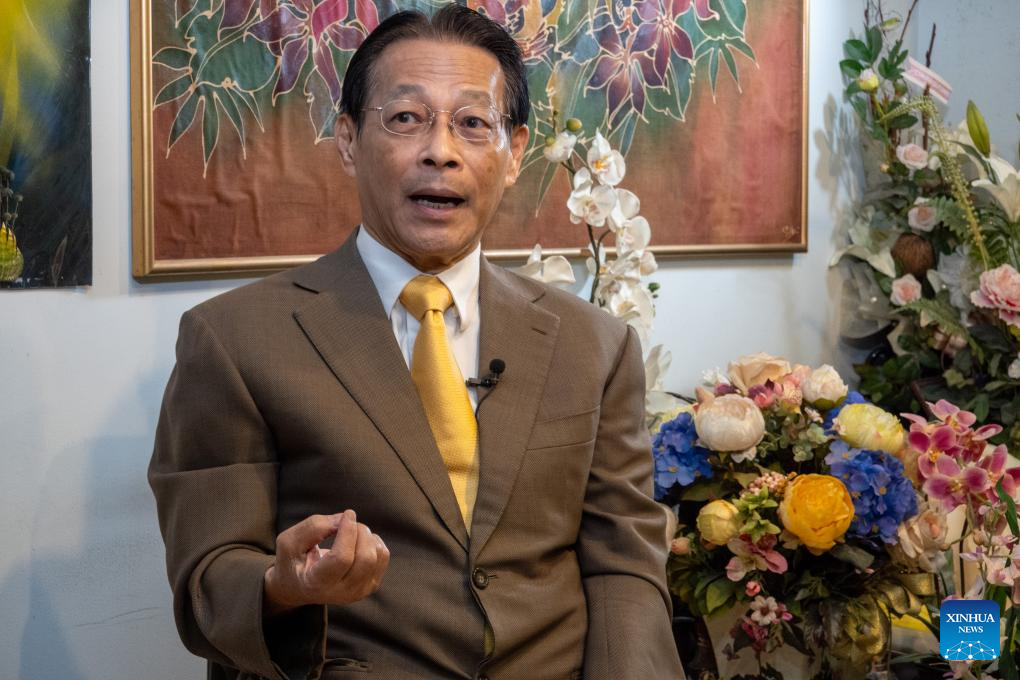 Former Thai Finance Minister Suchart Thadathamrongvech speaks during an interview with Xinhua in Bangkok, Thailand, on April 30, 2025. (Xinhua/Thana Nuntavoranut)