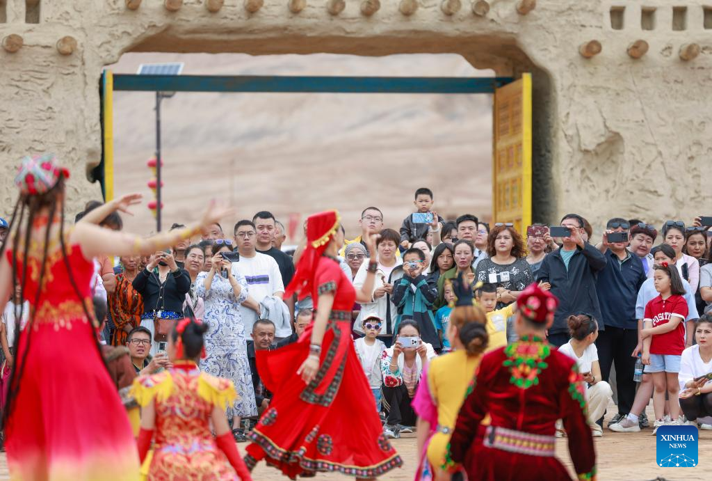 Tourists watch a folk art performance at a scenic area in Turpan, northwest China's Xinjiang Uygur Autonomous Region, May 4, 2025. People across China enjoy the ongoing May Day holiday in various ways. (Xinhua/Wang Fei)
