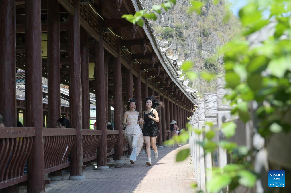 Tourists enjoy themselves at a scenic spot in Baise, south China's Guangxi Zhuang Autonomous Region, May 3, 2025. People across China enjoy the ongoing May Day holiday in various ways. (Photo by Miao Yucai/Xinhua)