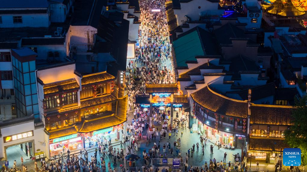 An aerial drone photo taken on May 3, 2025 shows tourists visiting the Fuzimiao scenic area in Nanjing, east China's Jiangsu Province. People across China enjoy the ongoing May Day holiday in various ways. (Photo by Yang Suping/Xinhua)