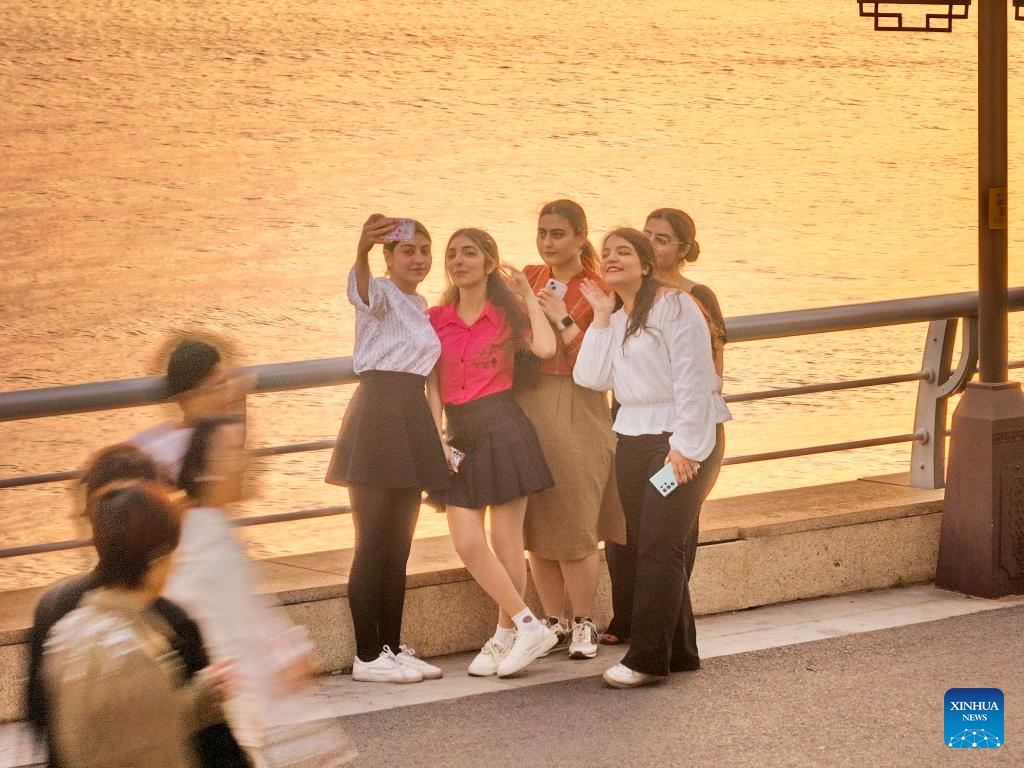Tourists take a selfie by the lakeside in Nantong City, east China's Jiangsu Province, May 3, 2025. People across China enjoy the ongoing May Day holiday in various ways. (Photo by Xu Congjun/Xinhua)