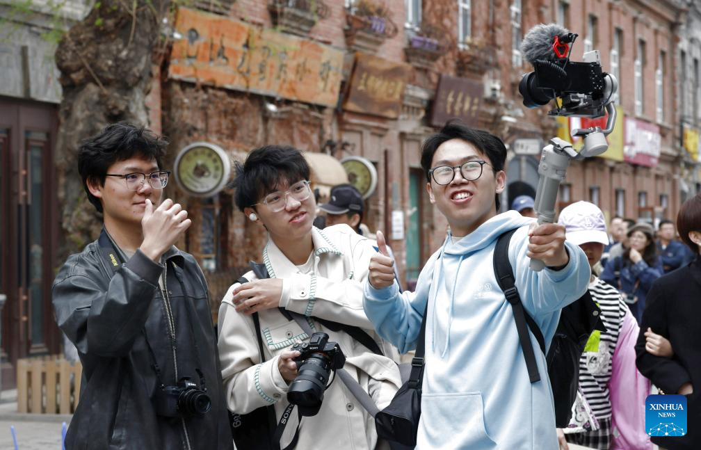 Vloggers shoot a video at a historical cultural area in Harbin, northeast China's Heilongjiang Province, May 1, 2025. People across China enjoy the ongoing May Day holiday in various ways. (Photo by Zhang Shu/Xinhua)