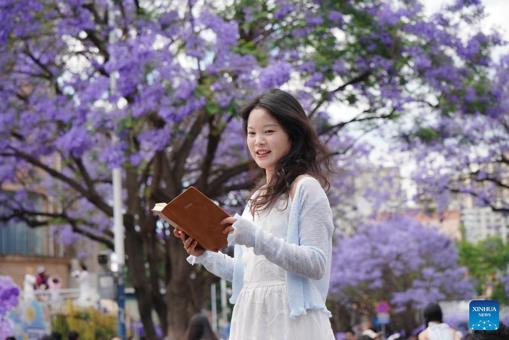 A girl poses for a photo with blooming jacaranda trees in Kunming, southwest China's Yunnan Province, May 4, 2025. People across China enjoy the ongoing May Day holiday in various ways. (Xinhua/Gao Yongwei)