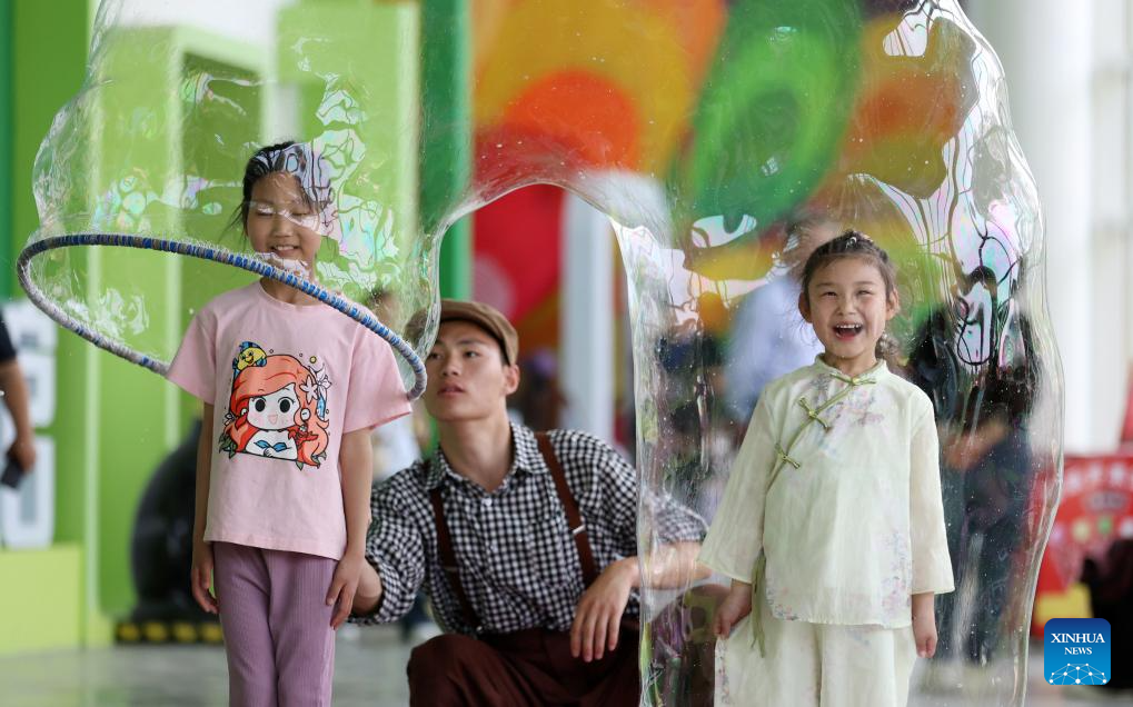 Children enjoy a bubble show in Tancheng County, Linyi City, east China's Shandong Province, May 4, 2025. People across China enjoy the ongoing May Day holiday in various ways. (Photo by Zhang Chunlei/Xinhua)