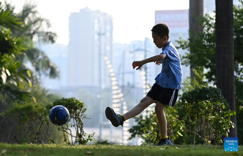 A child plays football by the Nanhu lake in Nanning, south China's Guangxi Zhuang Autonomous Region, May 2, 2025. People across China enjoy the ongoing May Day holiday in various ways. (Xinhua/Lu Boan)