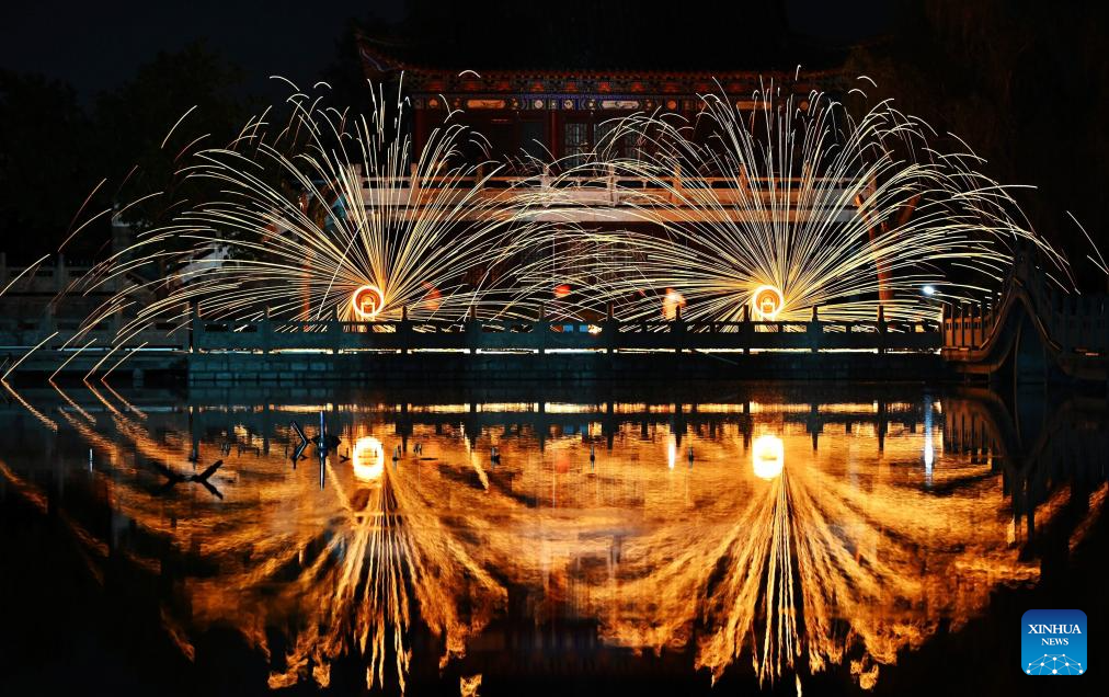 Folk artists perform a molten iron fireworks show in Tengzhong, east China's Shandong Province, May 3, 2025. People across China enjoy the ongoing May Day holiday in various ways. (Photo by Li Zhijun/Xinhua)