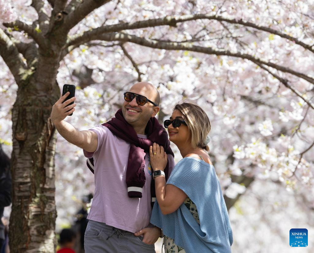 A man takes a selfie with cherry blossoms at High Park in Toronto, Canada, on May 6, 2025. (Photo by Zou Zheng/Xinhua)