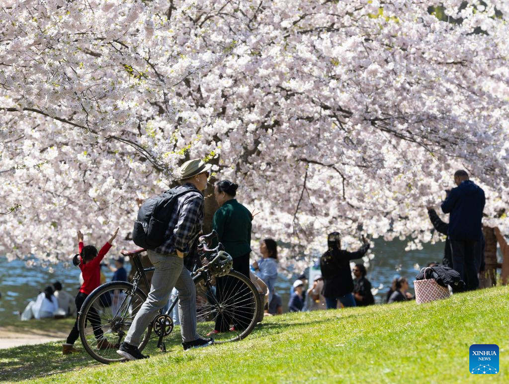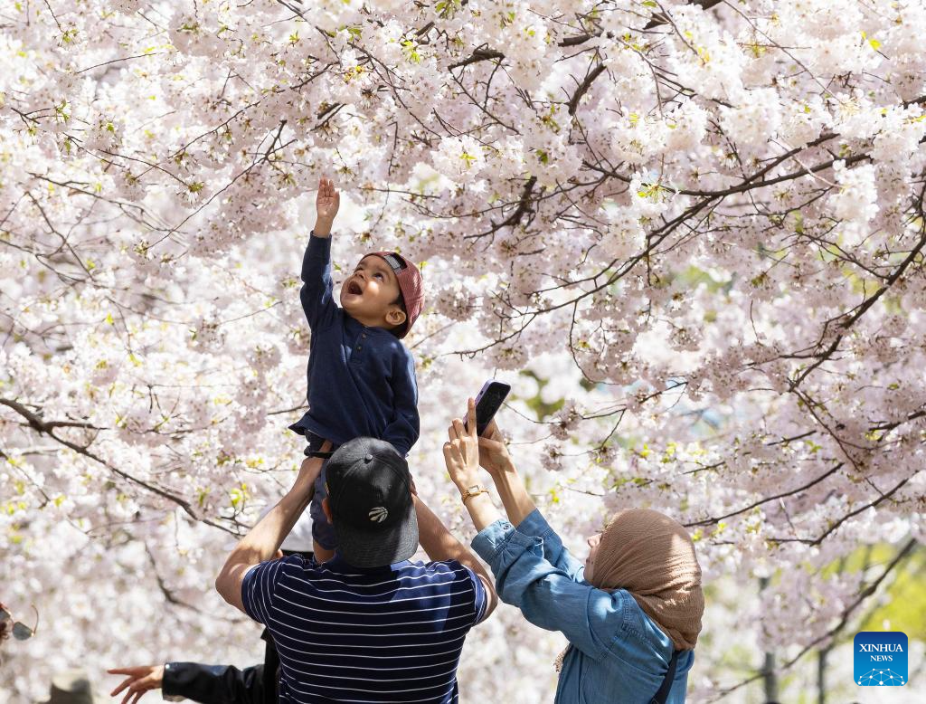 People spend time under cherry blossoms at High Park in Toronto, Canada, on May 6, 2025. (Photo by Zou Zheng/Xinhua)