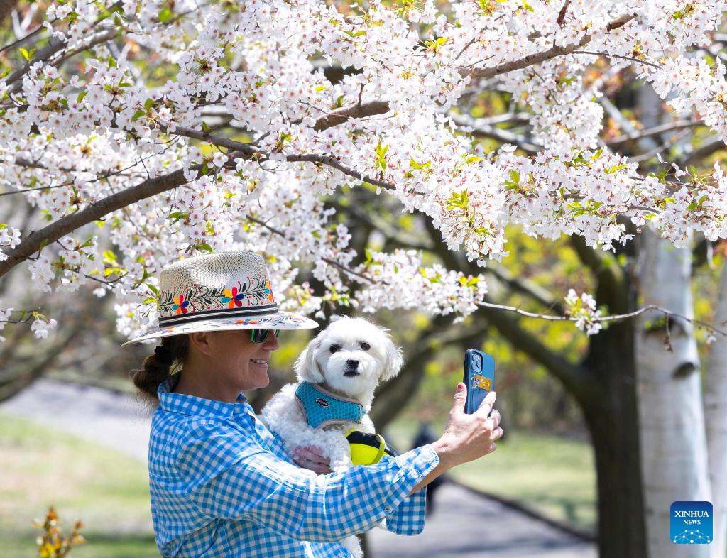A woman holding a pet dog takes a selfie with cherry blossoms at High Park in Toronto, Canada, on May 6, 2025. (Photo by Zou Zheng/Xinhua)