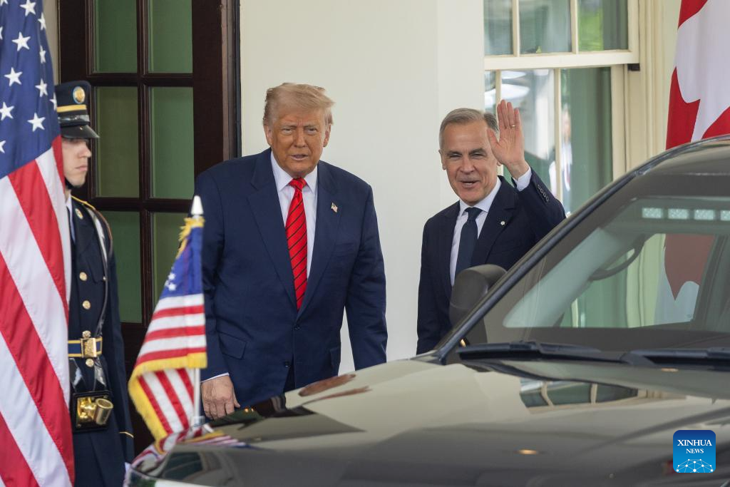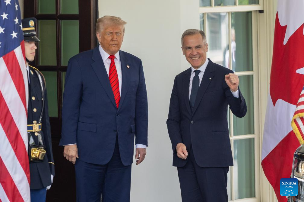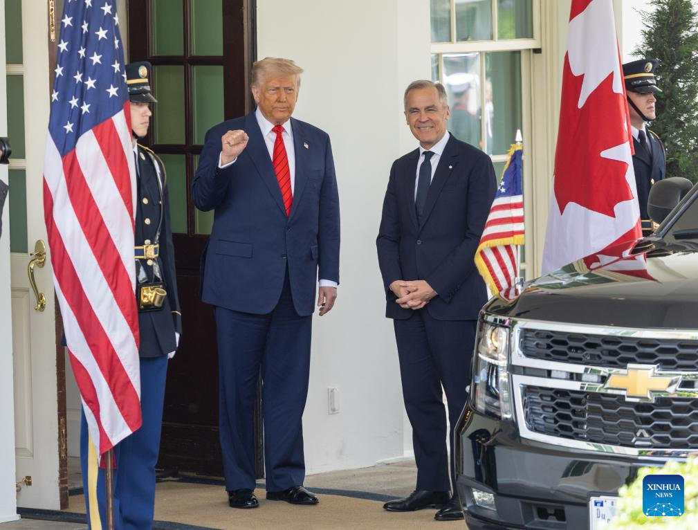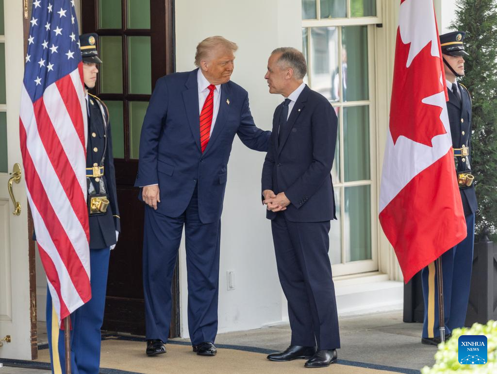 U.S. President Donald Trump (C) welcomes Canadian Prime Minister Mark Carney (R) at the White House in Washington, D.C., the United States, on May 6, 2025. U.S. President Donald Trump and Canadian Prime Minister Mark Carney met in the White House on Tuesday, disagreeing on the "51st state" and trade issues, according to the live broadcast of CBC News. (Xinhua/Hu Yousong)