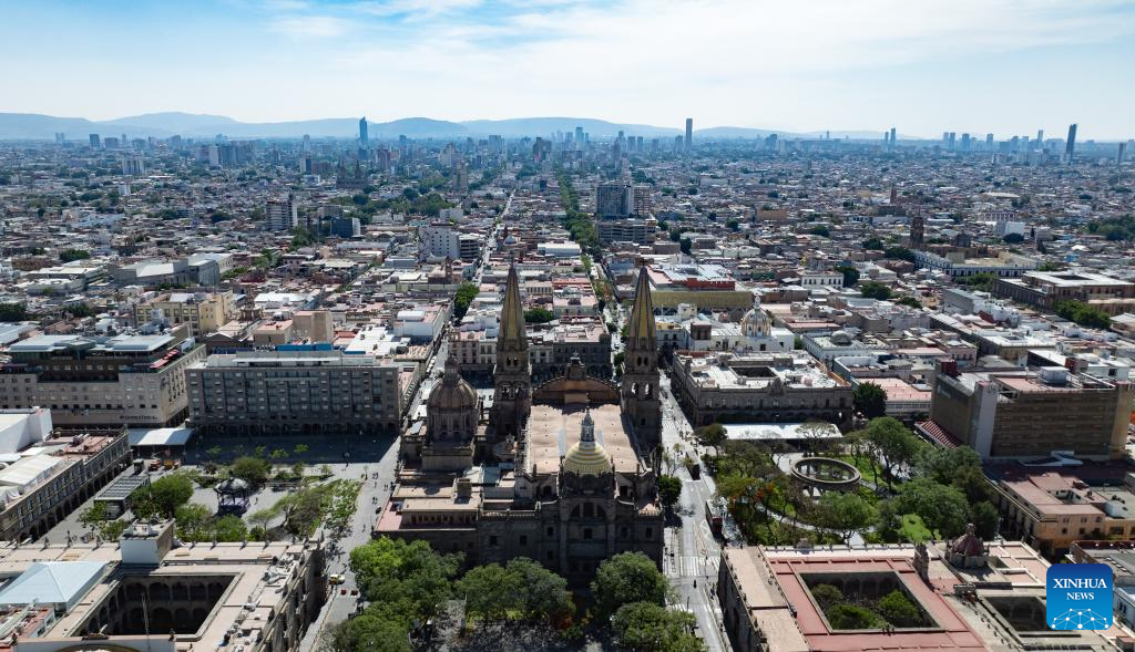 This aerial drone photo taken on May 8, 2025 shows the historic center of Guadalajara, Jalisco, Mexico. Guadalajara, Mexico's second-largest city, is a key economic hub and preserves rich cultural heritages. (Xinhua/Li Mengxin)