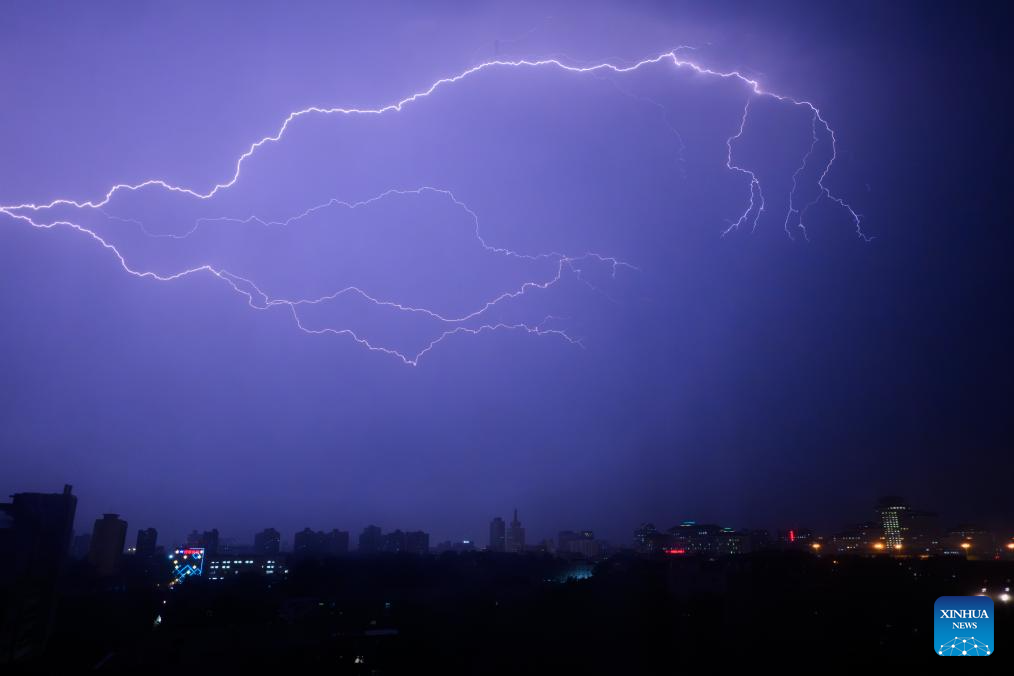 Lightning bolts appear in the sky during a thunderstorm in Haidian District, Beijing, capital of China, May 13, 2025. Parts of Beijing saw strong winds and thunderstorms on Tuesday. (Xinhua/Hu Jingwen)