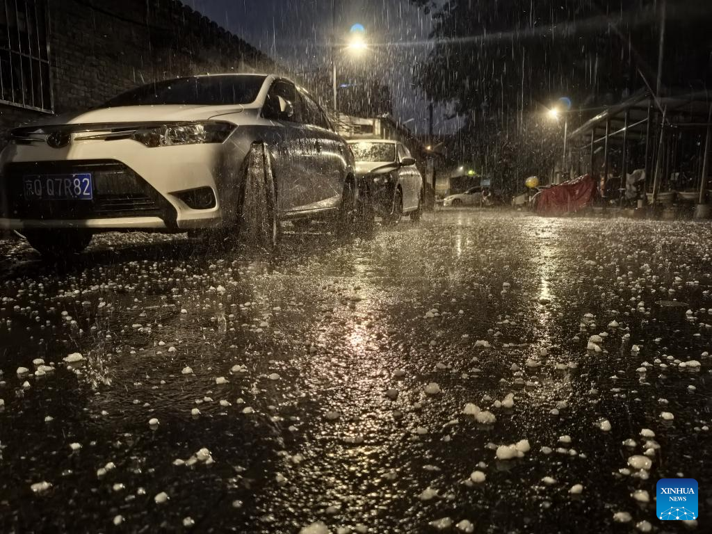 This photo taken on May 13, 2025 shows the hailstones in Xicheng District, Beijing, capital of China. Parts of Beijing saw strong winds and thunderstorms on Tuesday. (Xinhua/Li He)