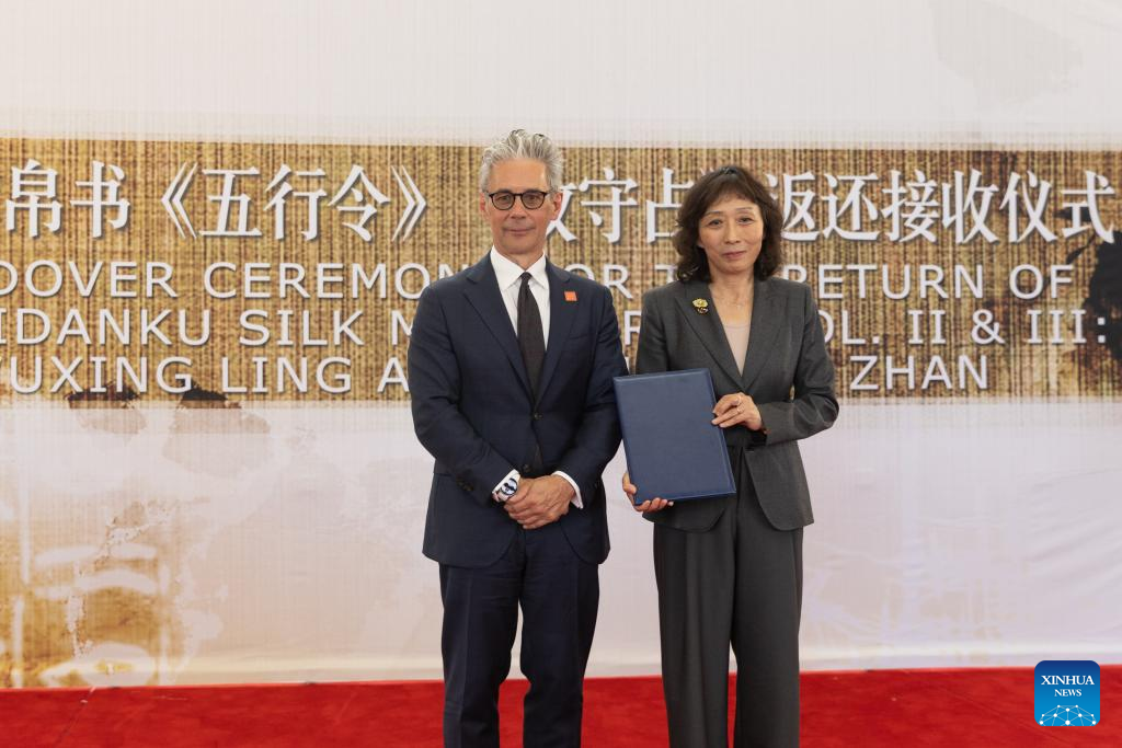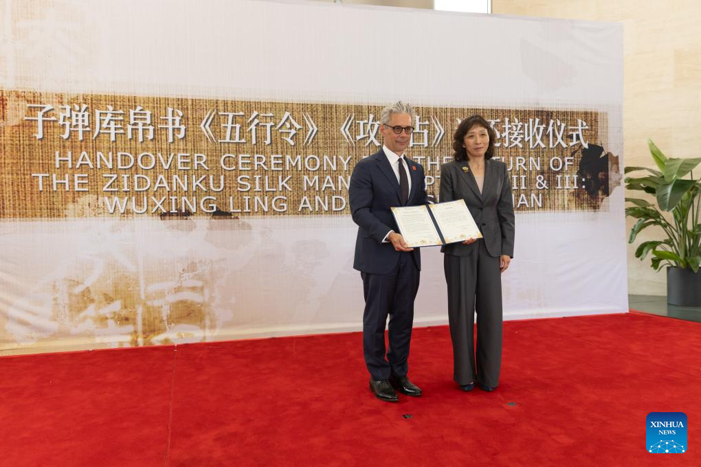 WASHINGTON, May 16 (Xinhua) -- The Smithsonian's National Museum of Asian Art on Friday officially returned the Zidanku Silk Manuscript volumes II and III: Wuxing Ling and Gongshou Zhan from the Warring States period to China's National Cultural Heritage Administration.