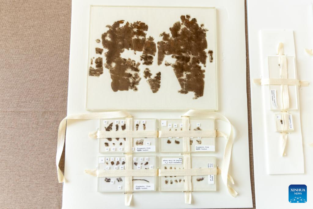 The ancient Zidanku Silk Manuscripts from the Warring States period are displayed during a handover ceremony at the Chinese Embassy in the United States in Washington, D.C., on May 16, 2025. (Xinhua/Hu Yousong)