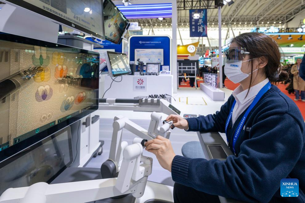 An exhibitor displays a remote surgical equipment at the 34th Harbin International Economic and Trade Fair in Harbin, capital of northeast China's Heilongjiang Province, May 17, 2025. The fair opened here on Saturday, attracting exhibitors from over 110 countries and regions. (Xinhua/Zhang Tao)