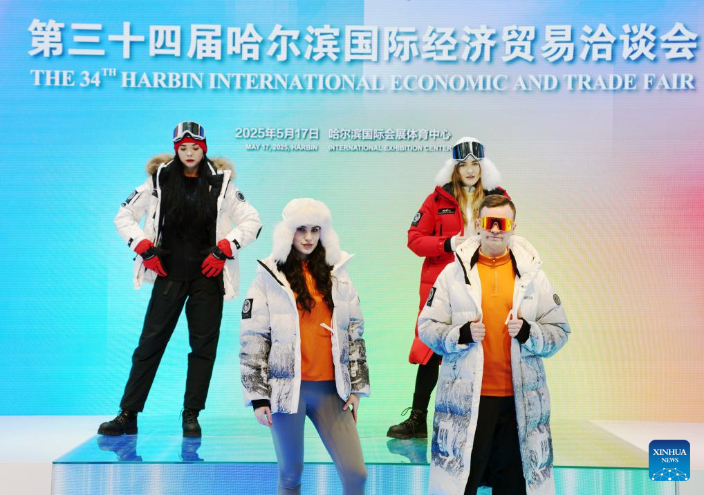 Models present Bosideng products at the 34th Harbin International Economic and Trade Fair in Harbin, capital of northeast China's Heilongjiang Province, May 17, 2025. The fair opened here on Saturday, attracting exhibitors from over 110 countries and regions. (Xinhua/Zhang Tao)