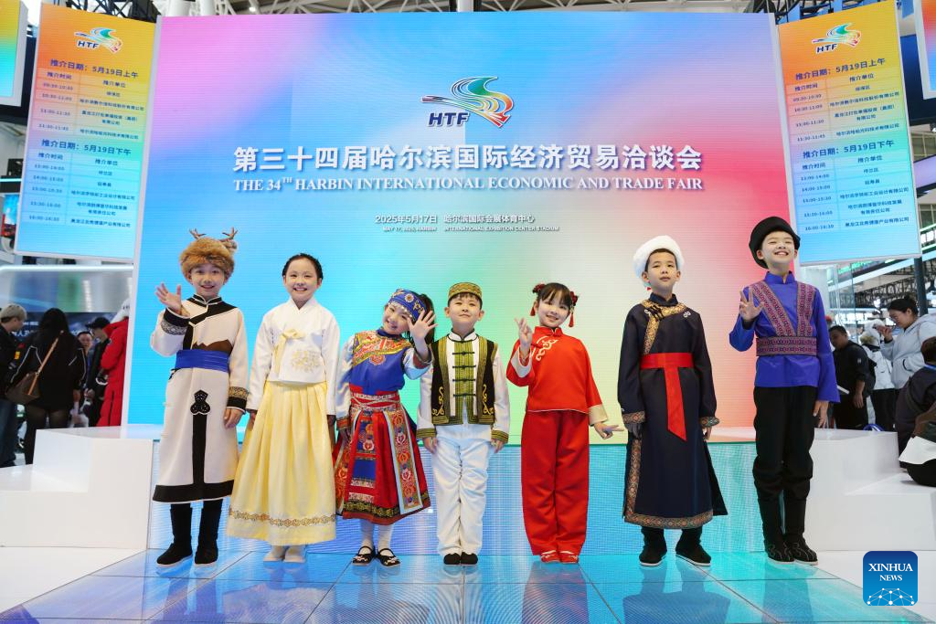 Children in ethnic costumes stage a show at the 34th Harbin International Economic and Trade Fair in Harbin, capital of northeast China's Heilongjiang Province, May 17, 2025. The fair opened here on Saturday, attracting exhibitors from over 110 countries and regions. (Xinhua/Wang Song)