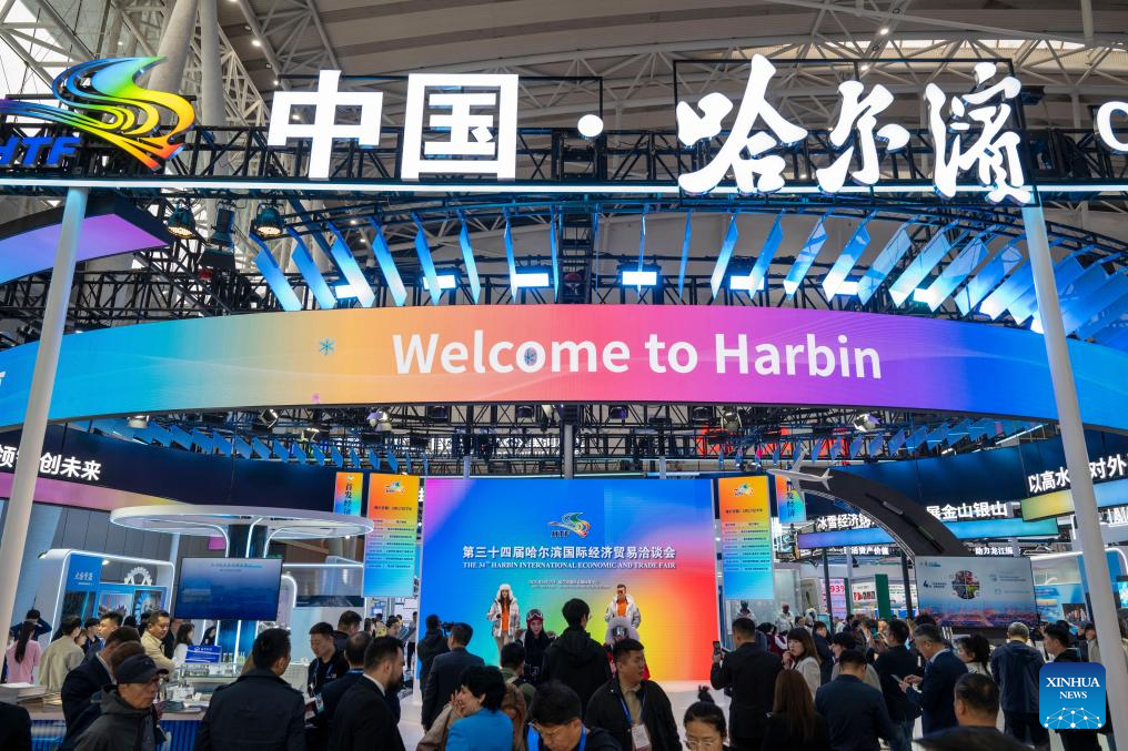 People visit the 34th Harbin International Economic and Trade Fair in Harbin, capital of northeast China's Heilongjiang Province, May 17, 2025. The fair opened here on Saturday, attracting exhibitors from over 110 countries and regions. (Xinhua/Zhang Tao)