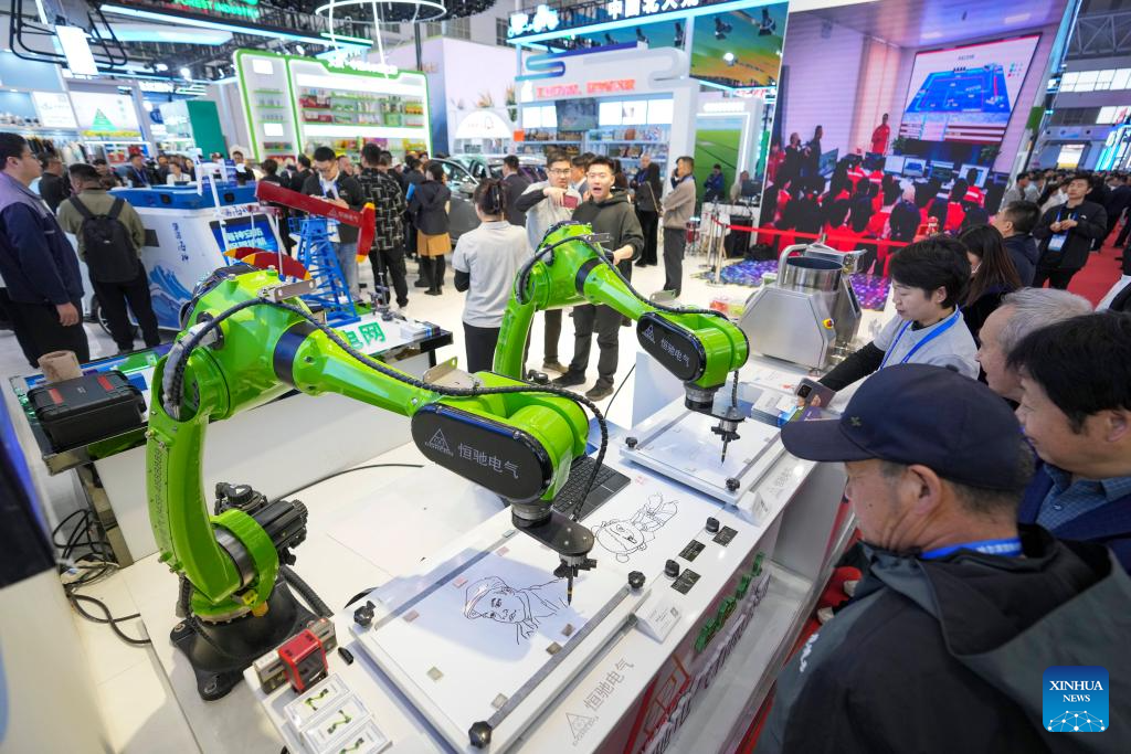 Visitors look at smart robotic arms at the 34th Harbin International Economic and Trade Fair in Harbin, capital of northeast China's Heilongjiang Province, May 17, 2025. The fair opened here on Saturday, attracting exhibitors from over 110 countries and regions. (Xinhua/Wang Jianwei)