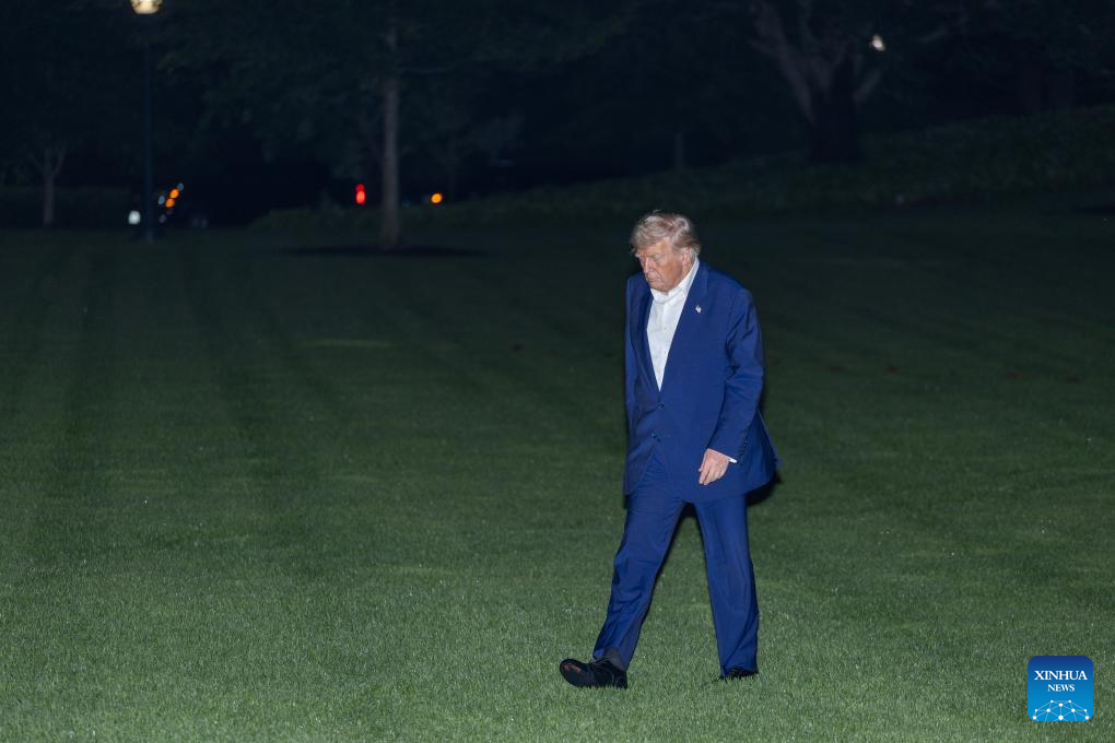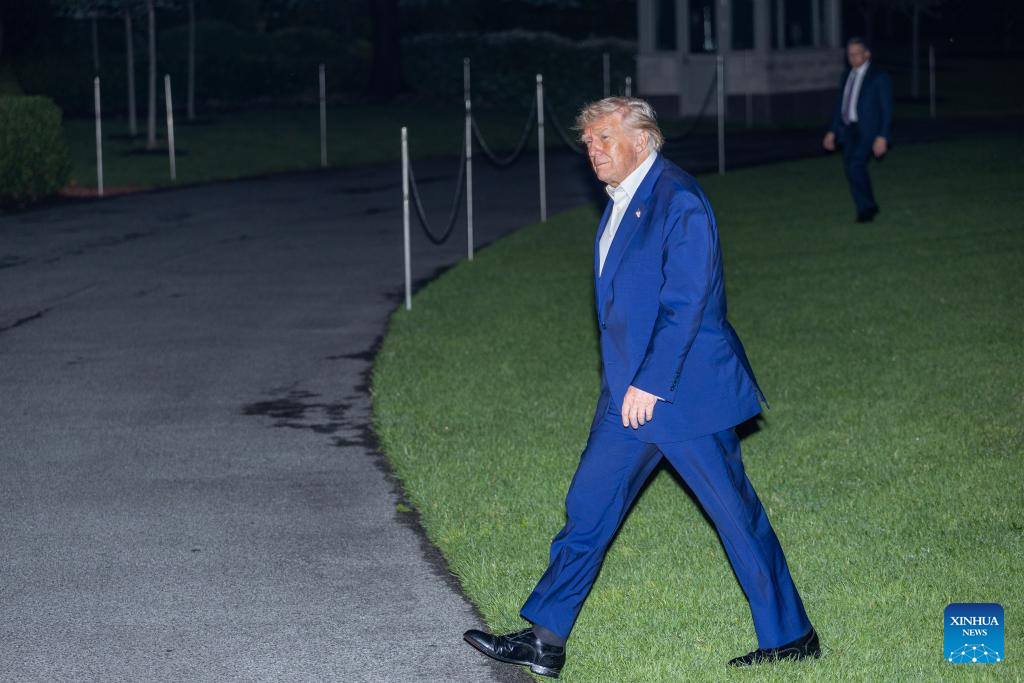 U.S. President Donald Trump walks on the South Lawn upon his return to the White House, following a trip to the Middle East, in Washington, D.C., the United States, on May 16, 2025.