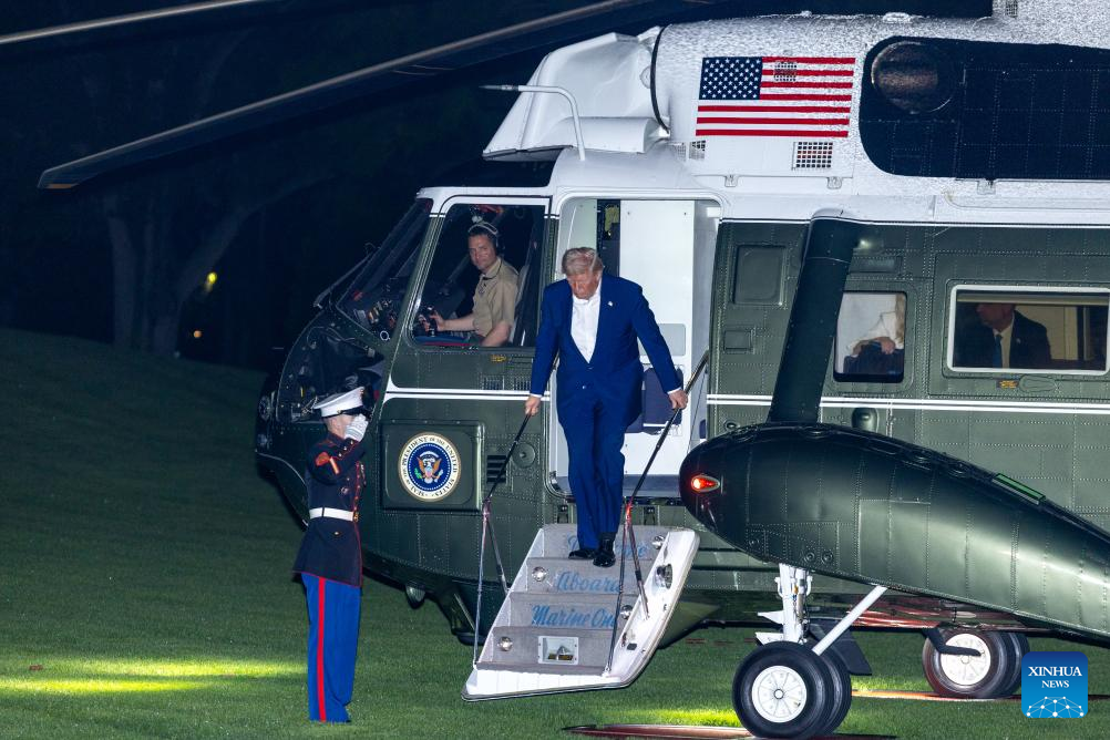 U.S. President Donald Trump steps off Marine One upon arrival on the South Lawn of the White House, following a trip to the Middle East, in Washington, D.C., the United States, on May 16, 2025.