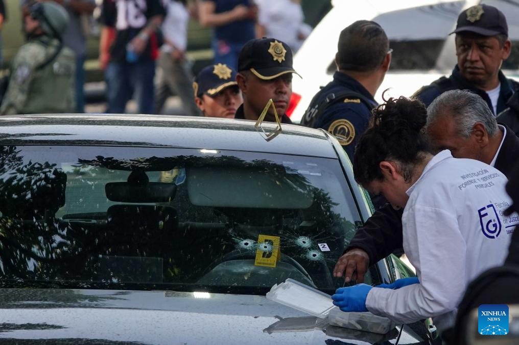 Forensic investigation and expert services personnel, together with security personnel, work after an attack on the vehicle, in which Mexico City Mayor Clara Brugada's personal secretary Ximena Guzman and adviser Jose Munoz were traveling, in Mexico City, Mexico, on May 20, 2025. Two close collaborators of Mexico City Mayor Clara Brugada were murdered in an attack on Tuesday morning: her personal secretary Ximena Guzman and her adviser Jose Munoz. (Str/Xinhua)
