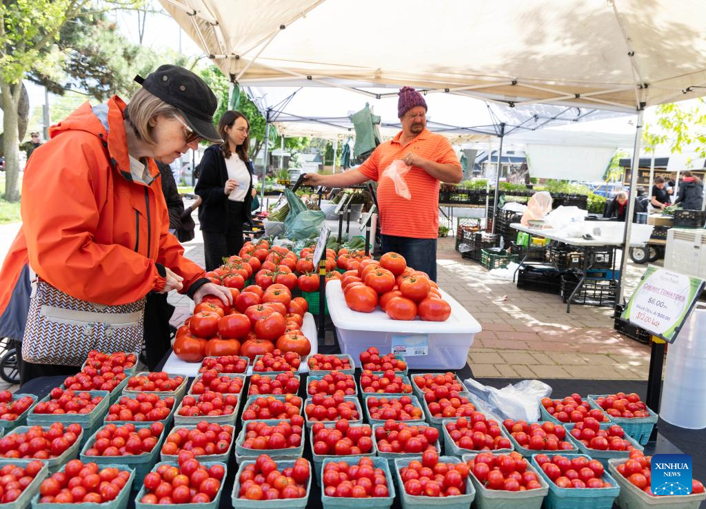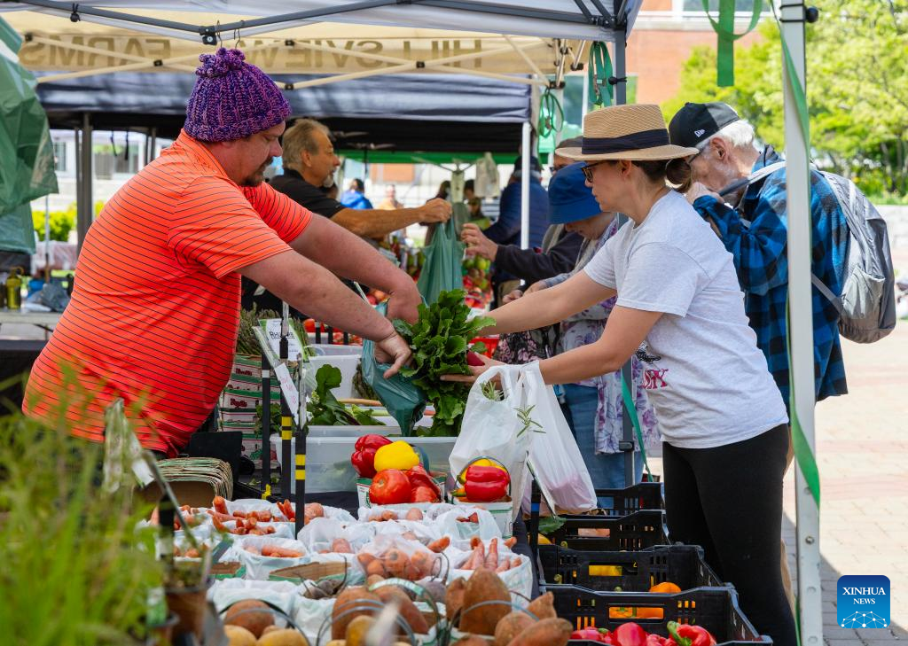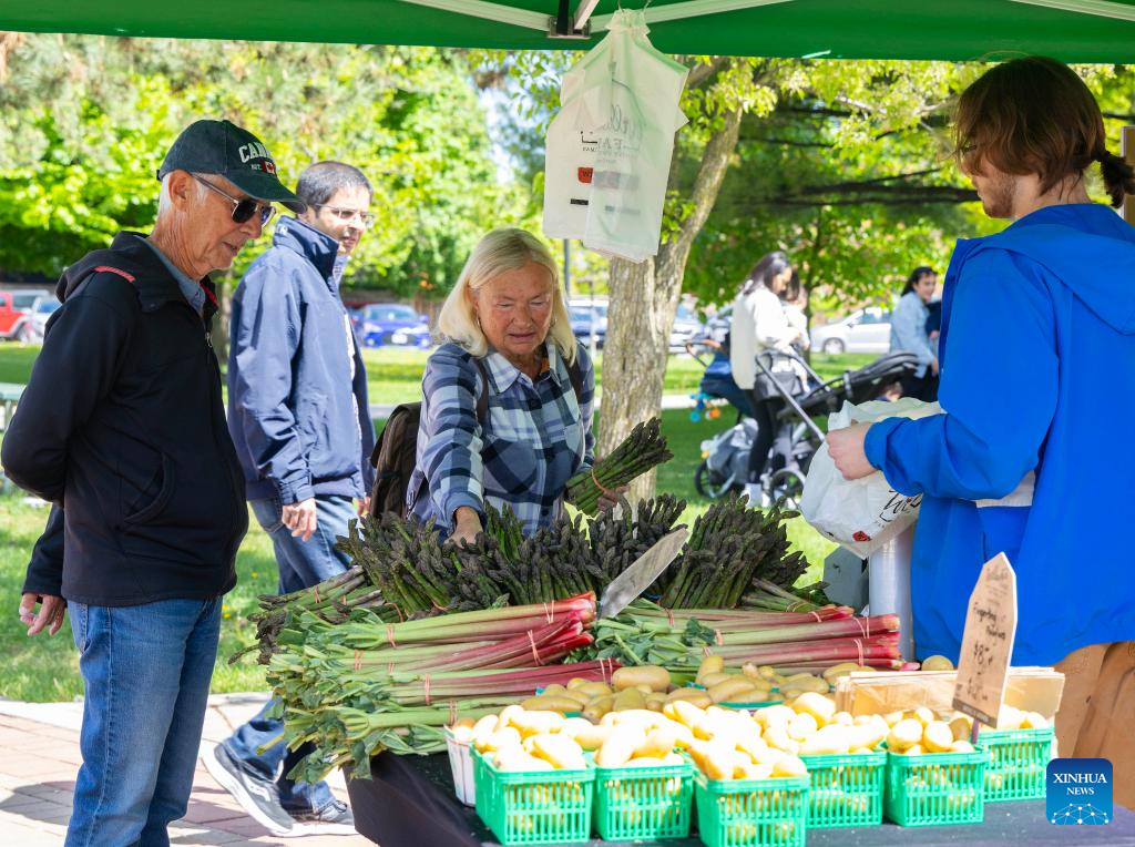 People shop for groceries at a farmers' market in Toronto, Canada, on May 20, 2025. Canada's Consumer Price Index (CPI) rose 1.7 percent year over year in April, down from a 2.3 percent increase in March, Statistics Canada said on Tuesday. (Photo by Zou Zheng/Xinhua)